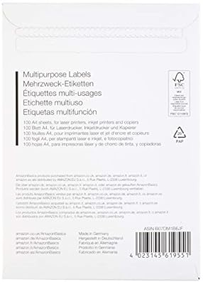 Siamo felici di offrire AmazonBasics - Etichette Multiuso, 210.0mm x 297.0mm, 100 fogli, 1 etichette per foglio, 100 etichette nella categoria AmazonBasics.